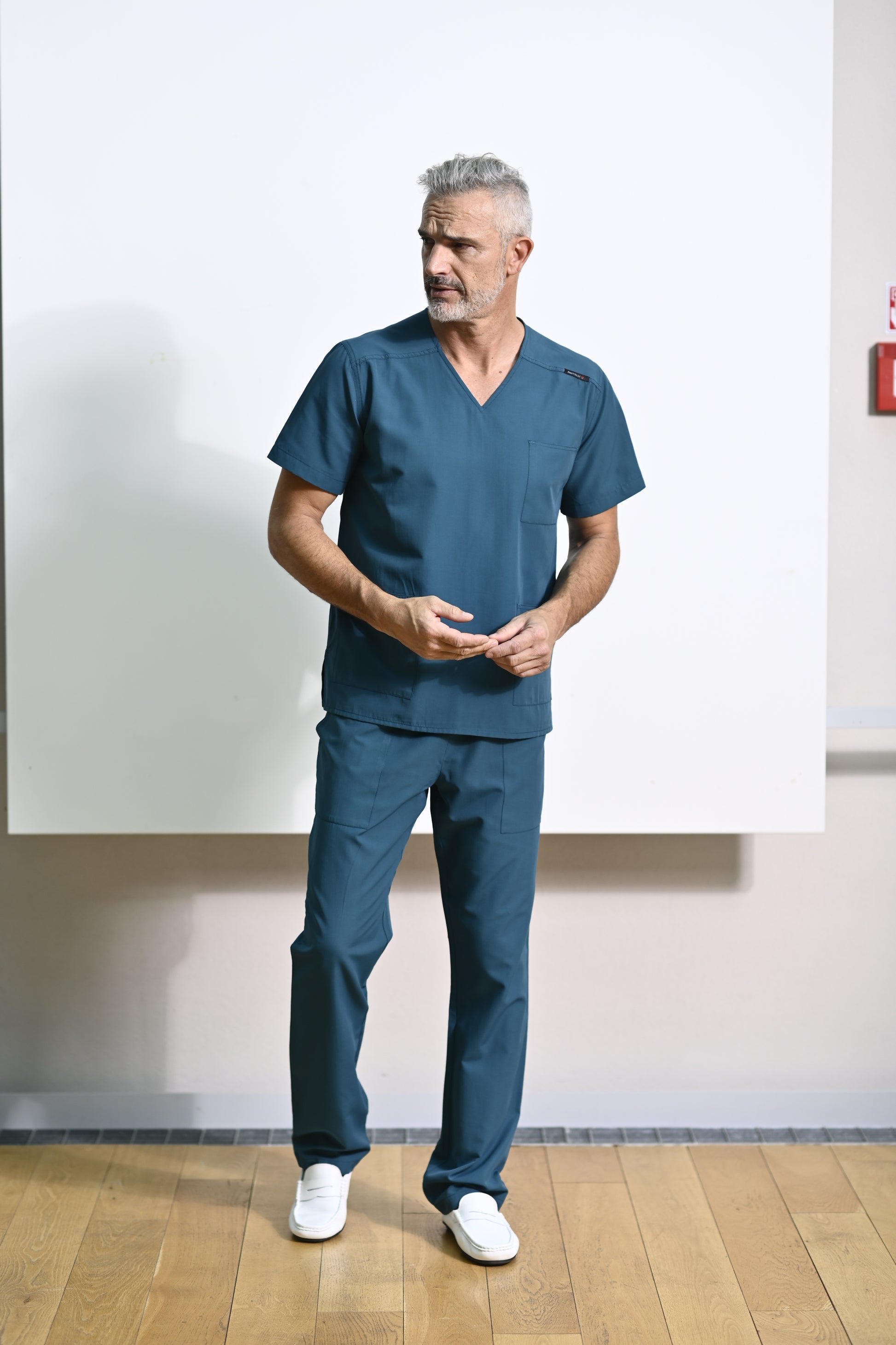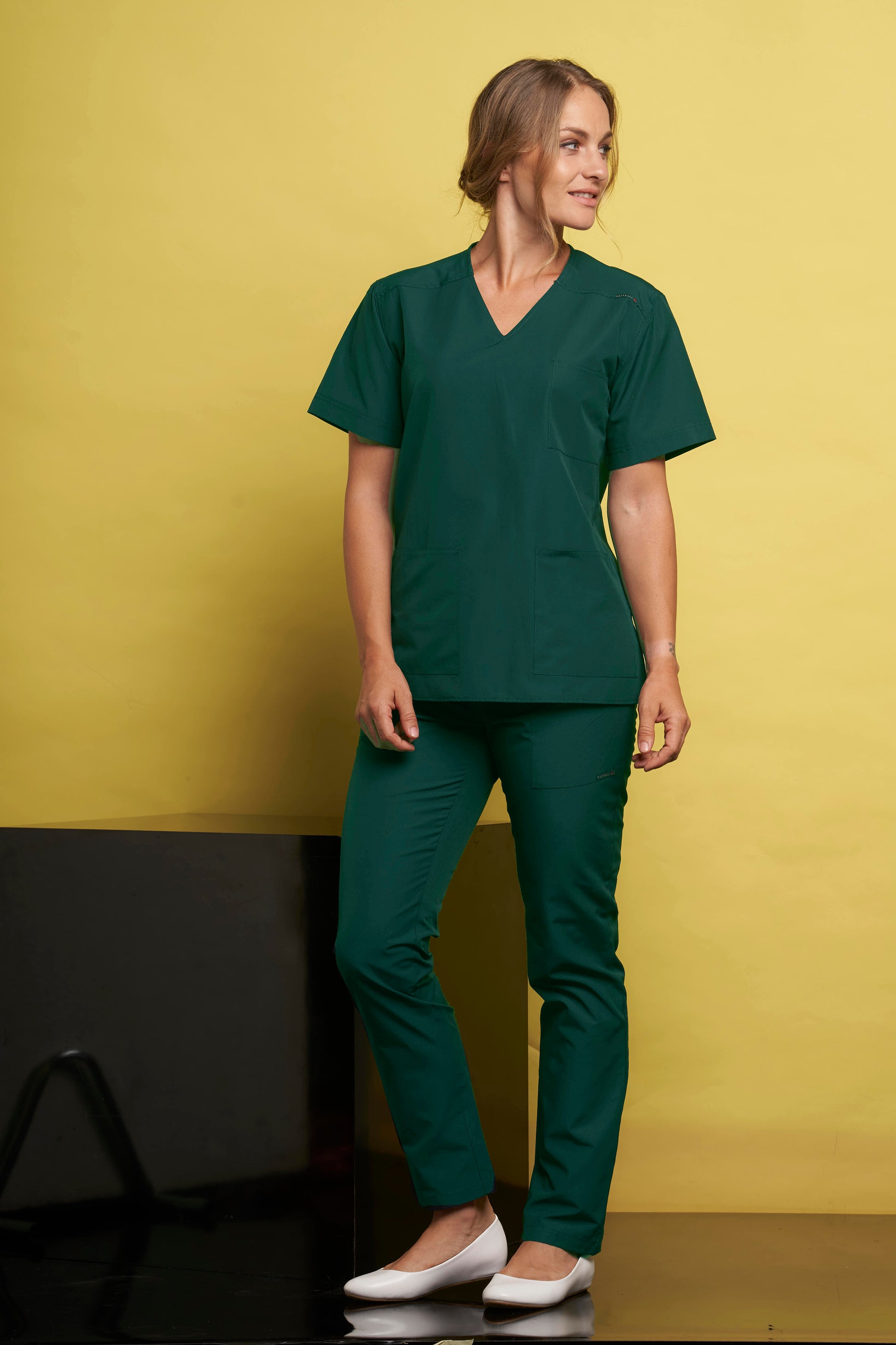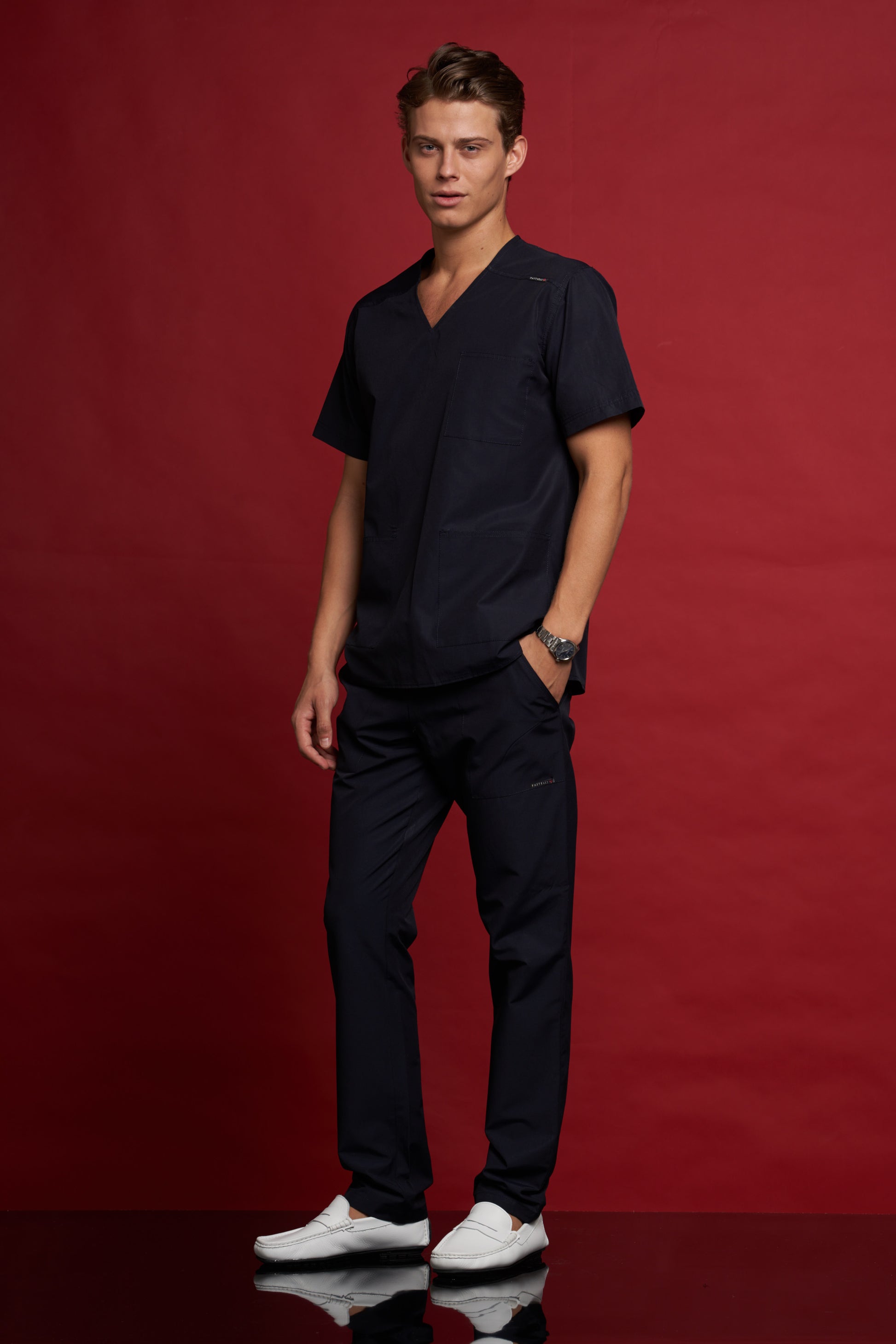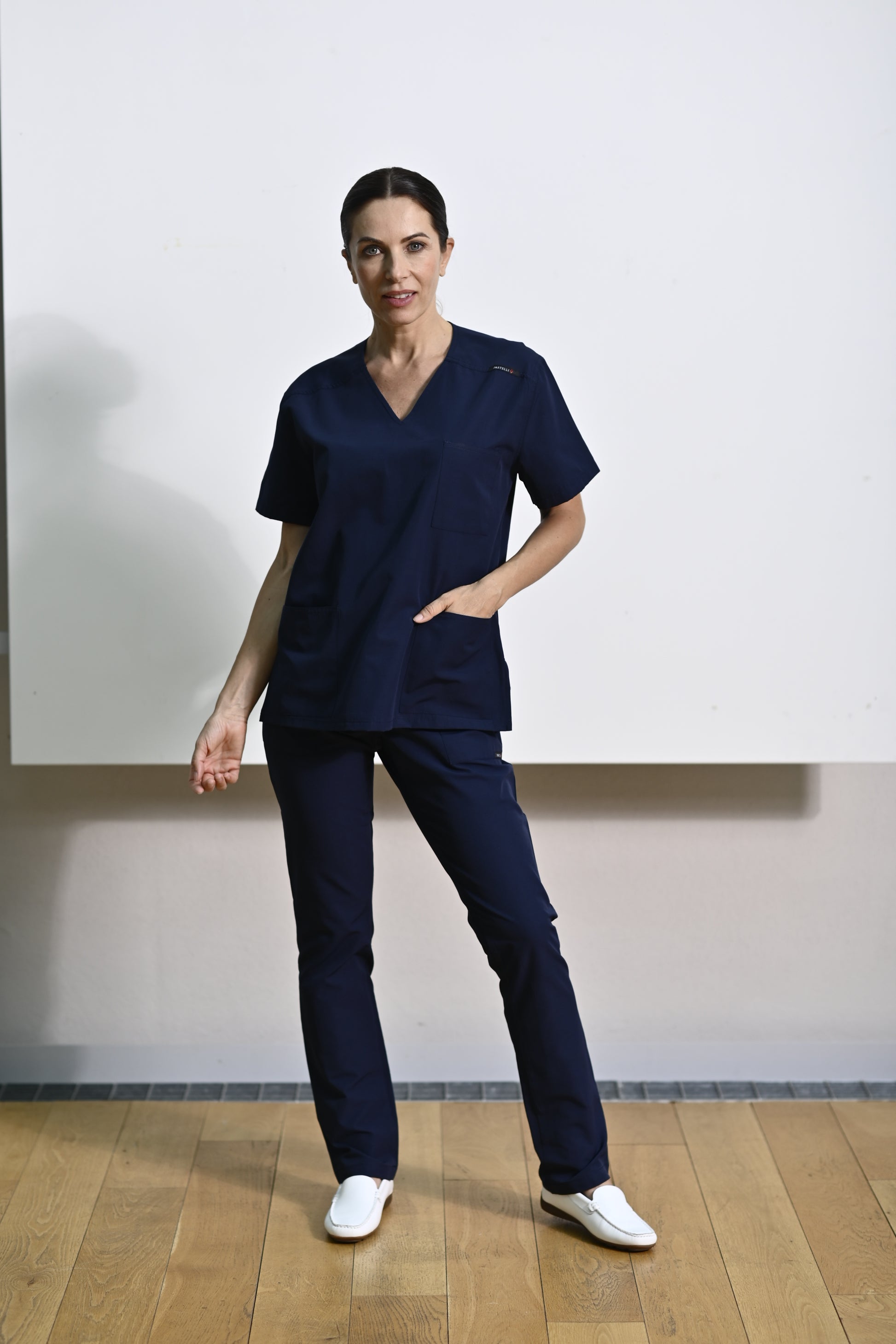 The suit features rich trims and high wearability, making it a timeless work suit. The elegant trousers with a modern cut and short-sleeved tunic provide sophistication and practicality in any professional environment.