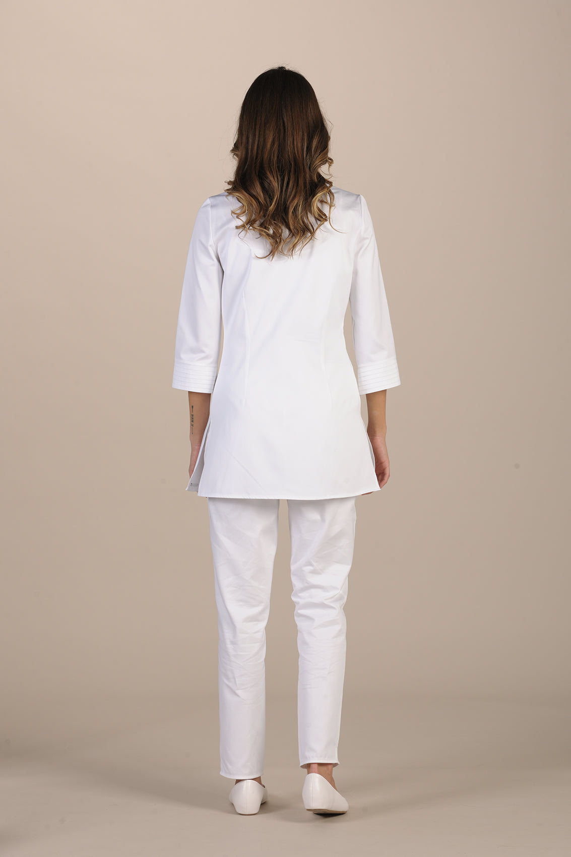 Simple but full of refined details, the Bithia model has a small V-neck fastened with hidden buttons, which gives the garment an elegant look. The dress has slightly flared ¾ sleeves for ease of movement and useful hidden side pockets. The design of the garment is characterized by flat and wide pleats, fine work on the sleeves and under the chest.