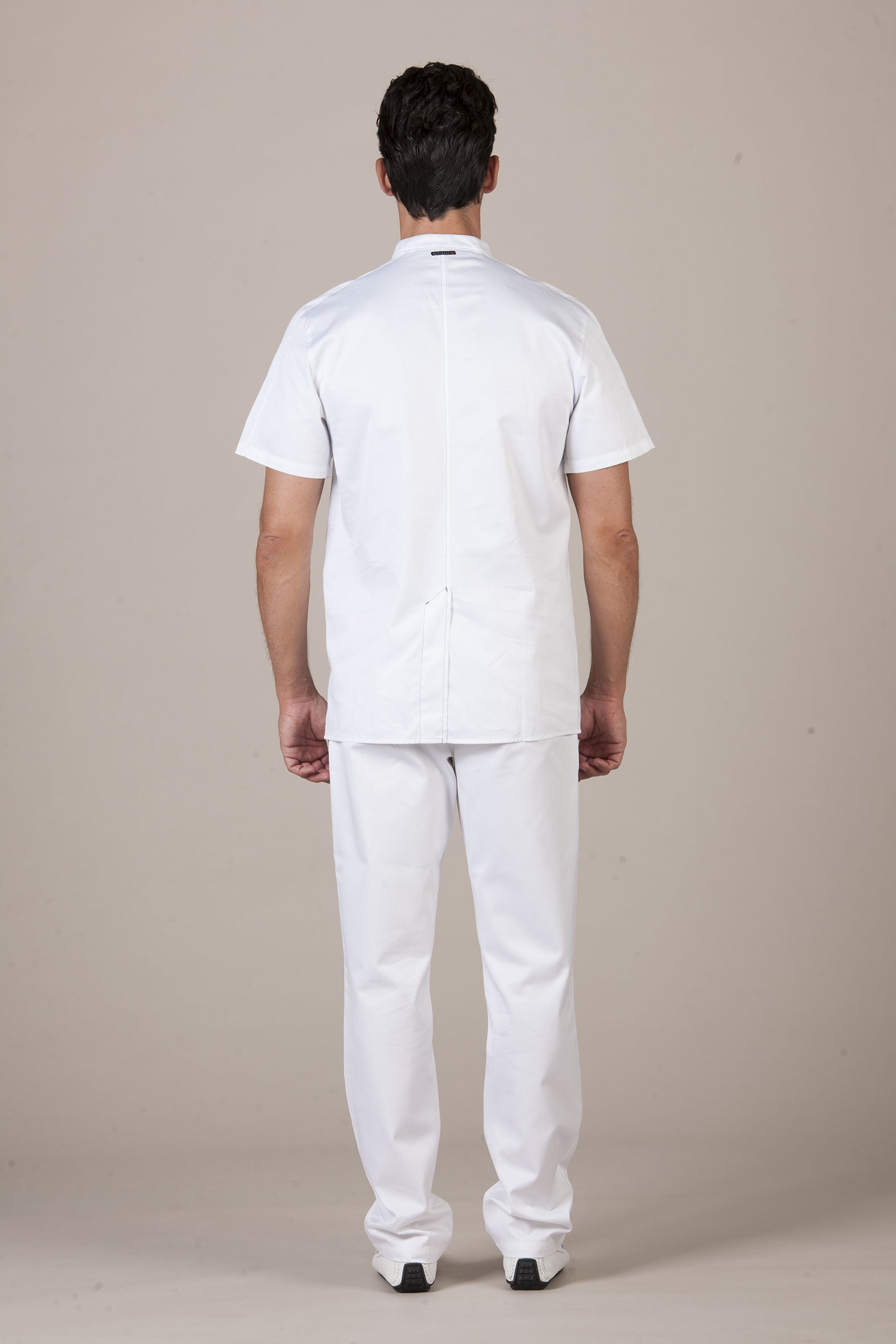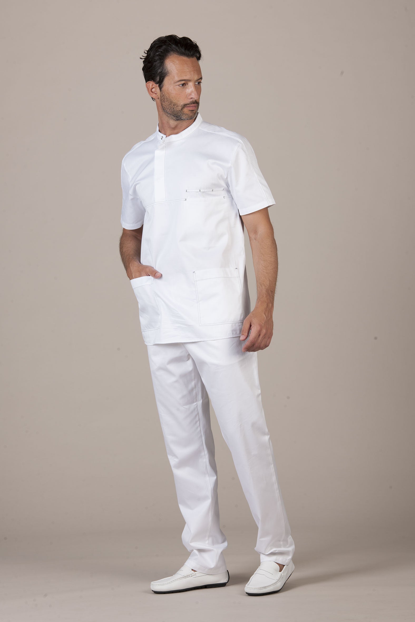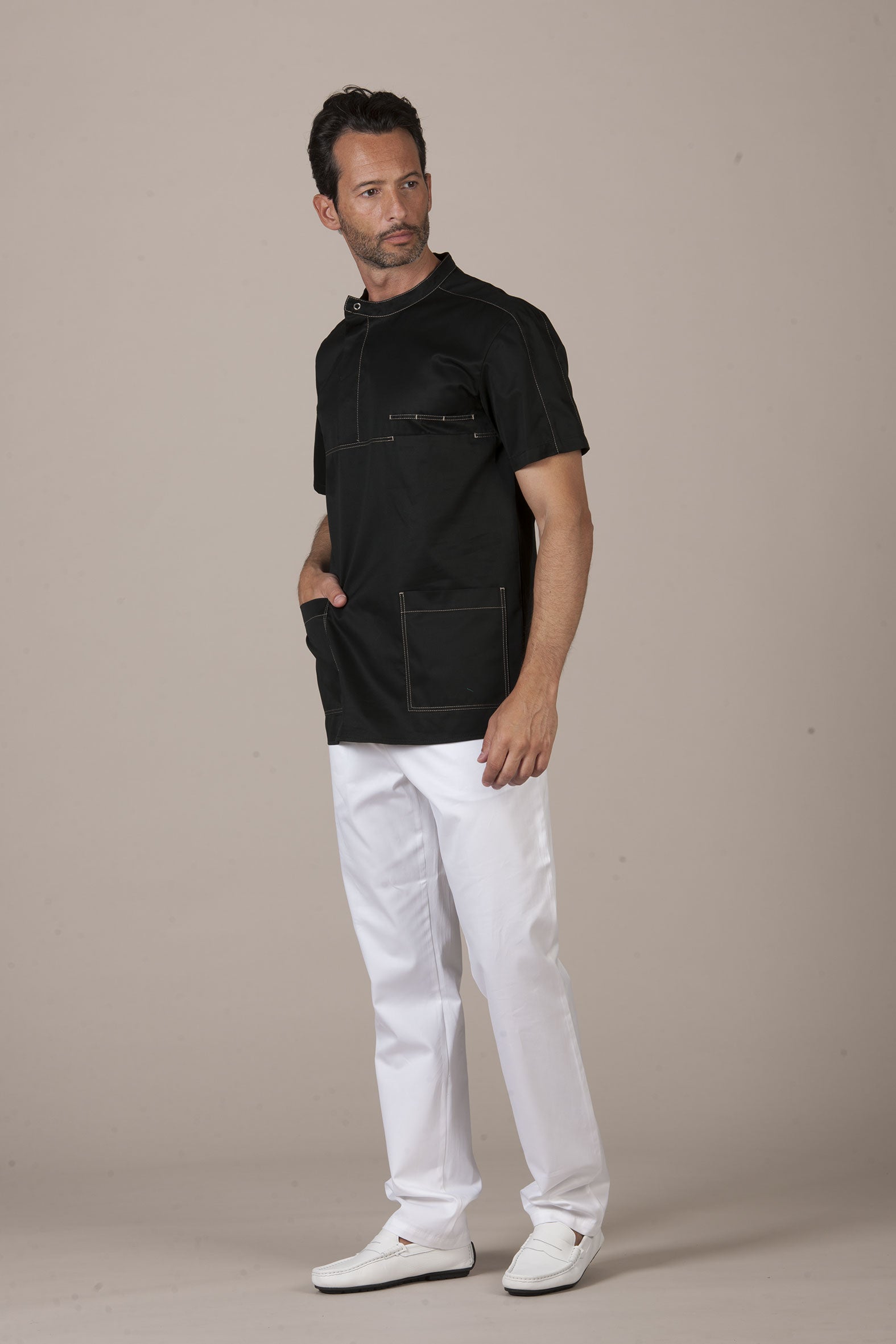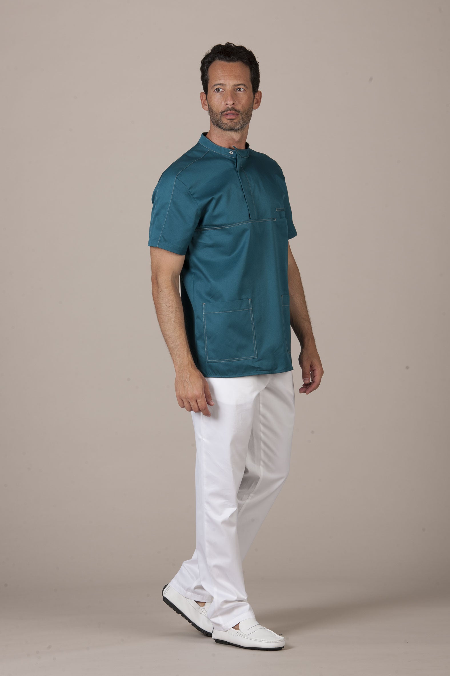 The Cardiff lab jacket by Pastelli is a men's jacket designed for medical workers. The tunic is in the Russian style, characterized by slightly contrasting stitching with the fabric, a mid-chest fastening, a placket with nickel-free buttons slightly offset from the center of the chest. The "cartridge belt" on the chest, located above the pocket, gives the garment a special and unique touch.