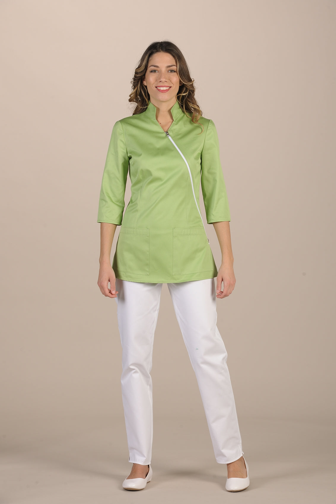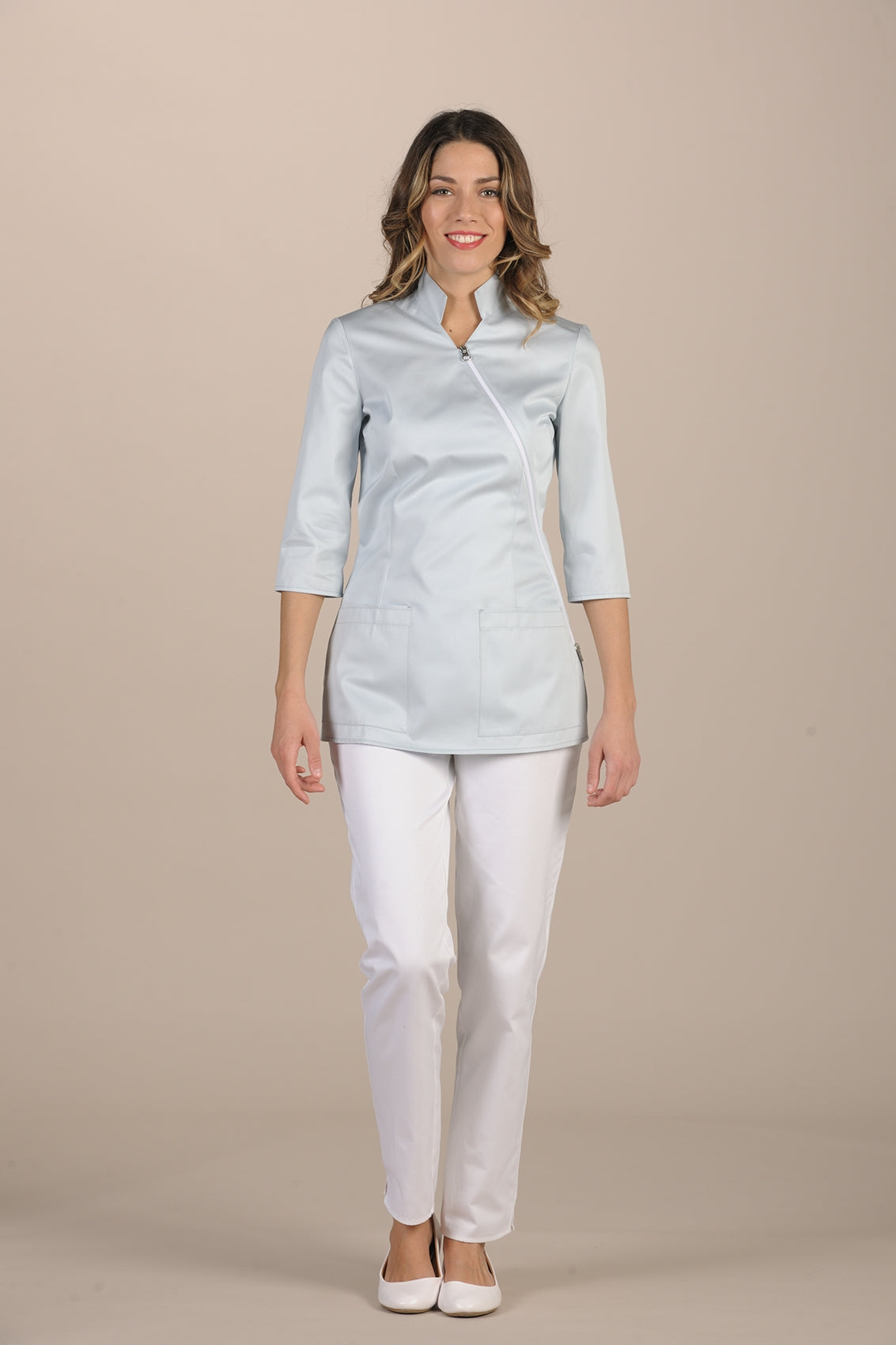 Nuraxi is a garment by Pastelli designed for women. A classic model, especially appreciated by our customers for the elegance it conveys. Comfortable and easy to wear, Nuraxi is loved for its ability to slim the figure, and the ¾-length sleeves make it ideal for any climate and visually lengthen the silhouette. The white diagonal zipper gives the tunic an aesthetic line, and the large front pockets provide the convenience needed by professionals in the medical field.