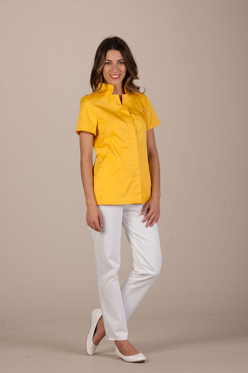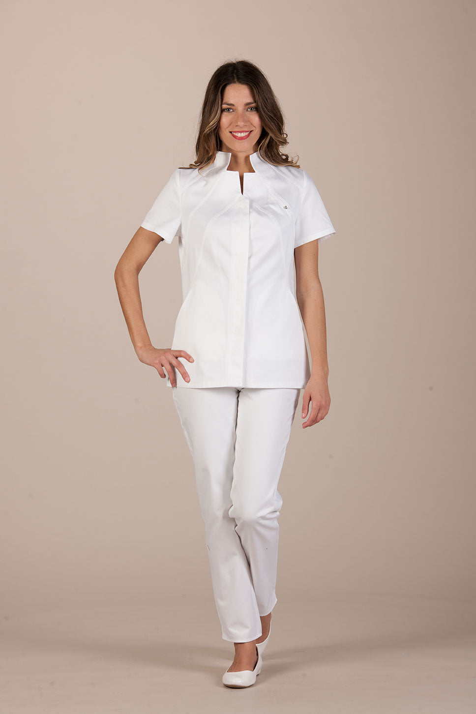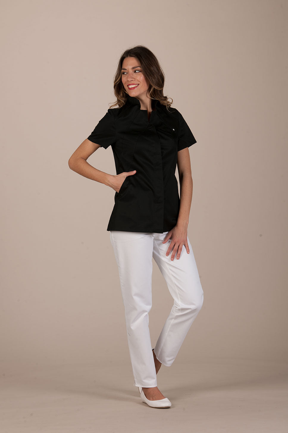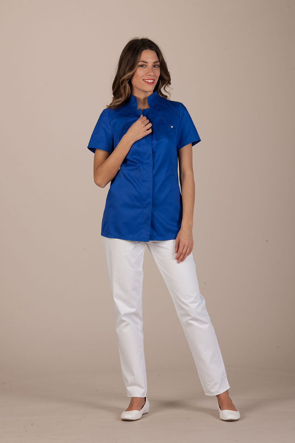 Vevey is an elegant and sophisticated women's tunic by Pastelli, designed to amaze customers and attract attention in the atelier. Medical uniform with a charming Vulcan collar, emphasized by double bias stitching. An elegant uniform that becomes precious thanks to a small Swarovski set on the chest, an elegant light that hides a convenient pocket inserted between the seams.