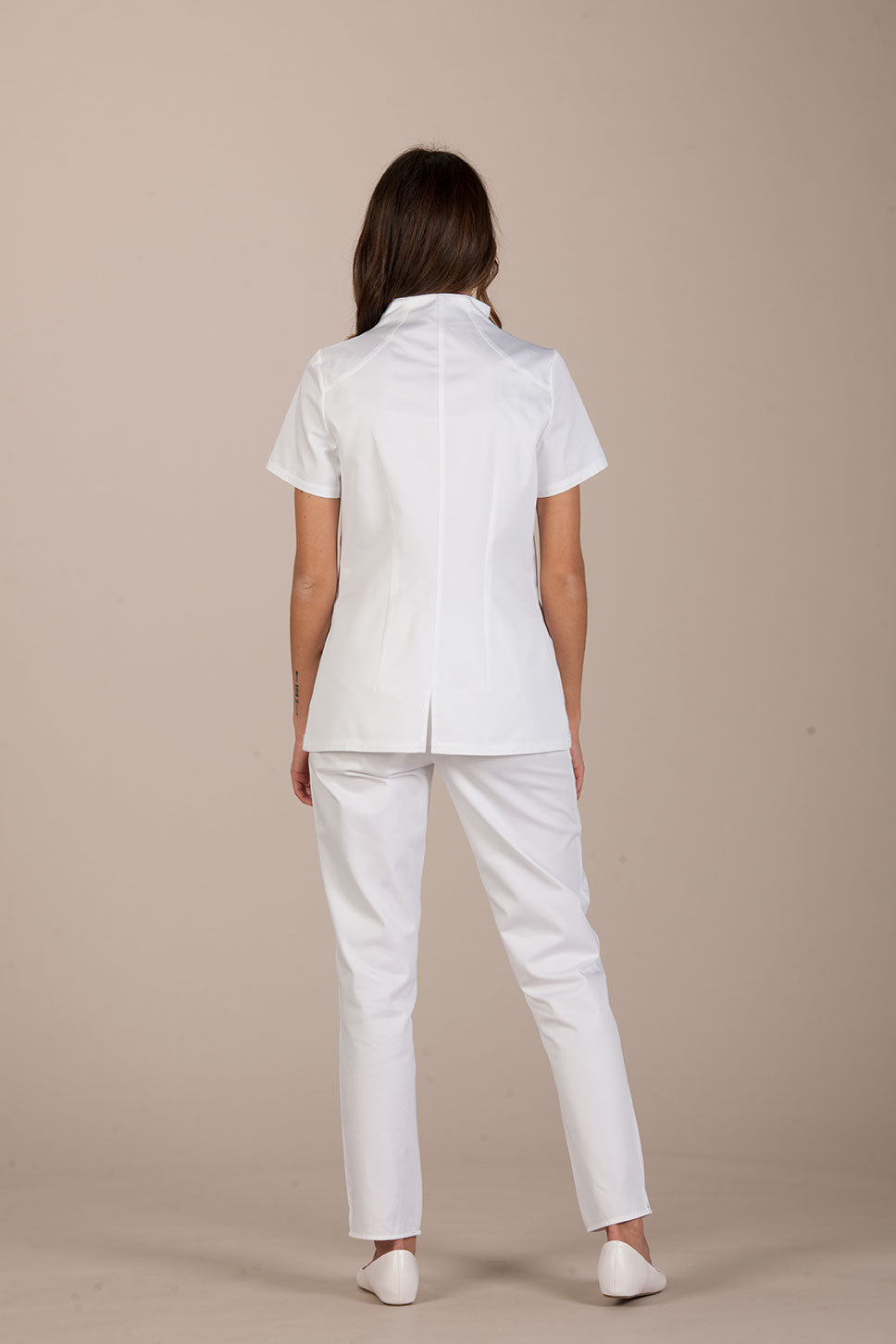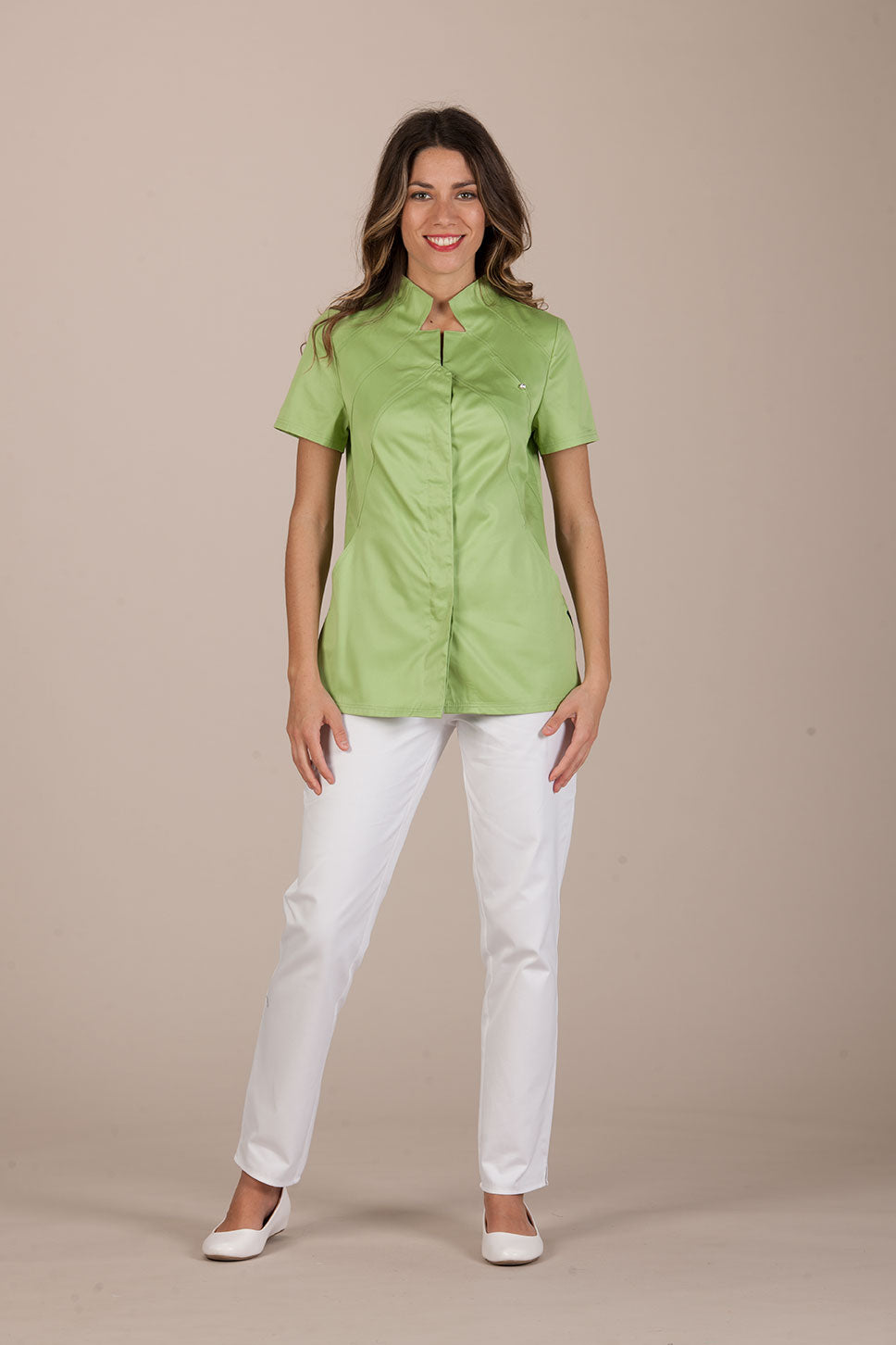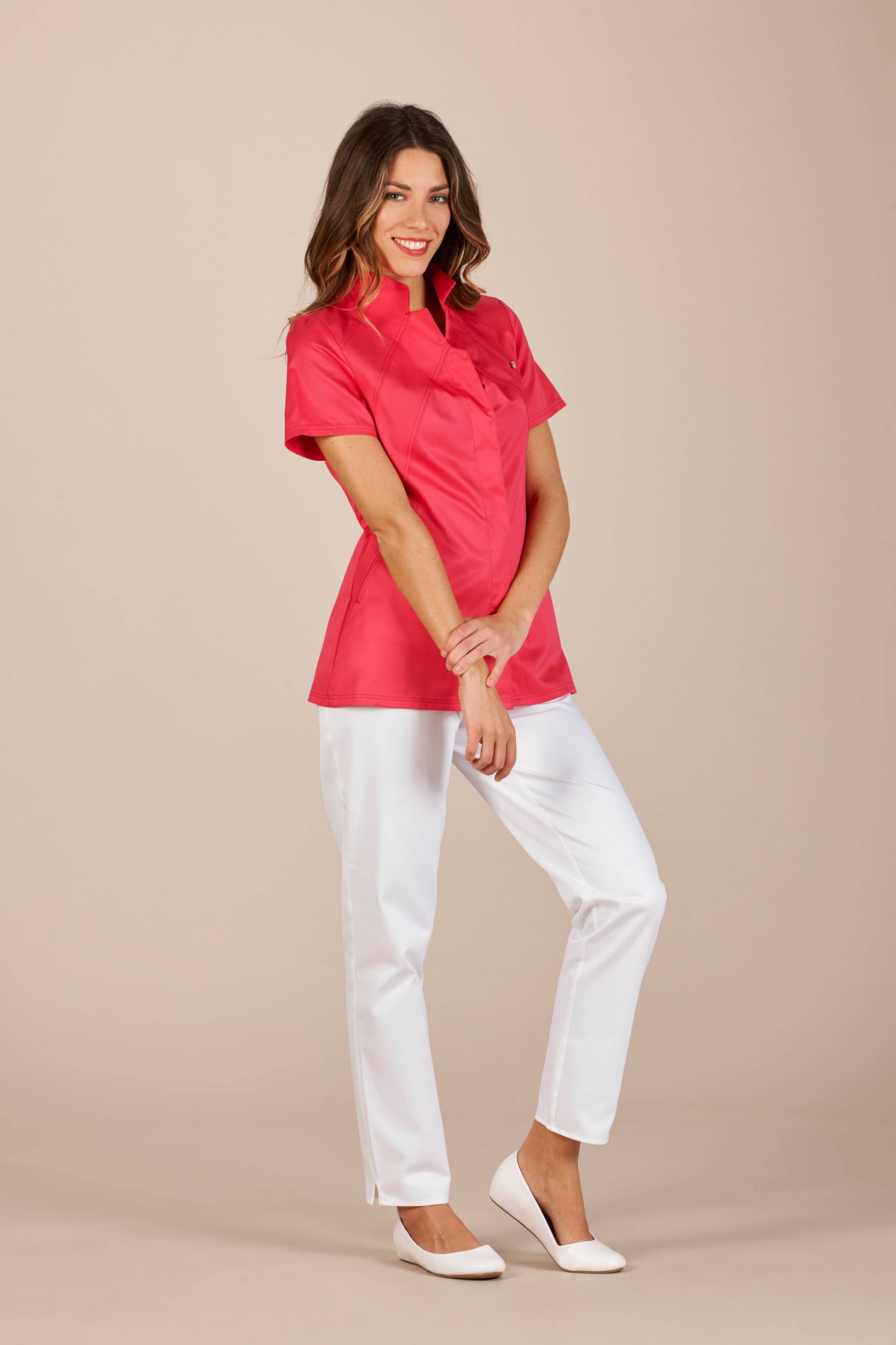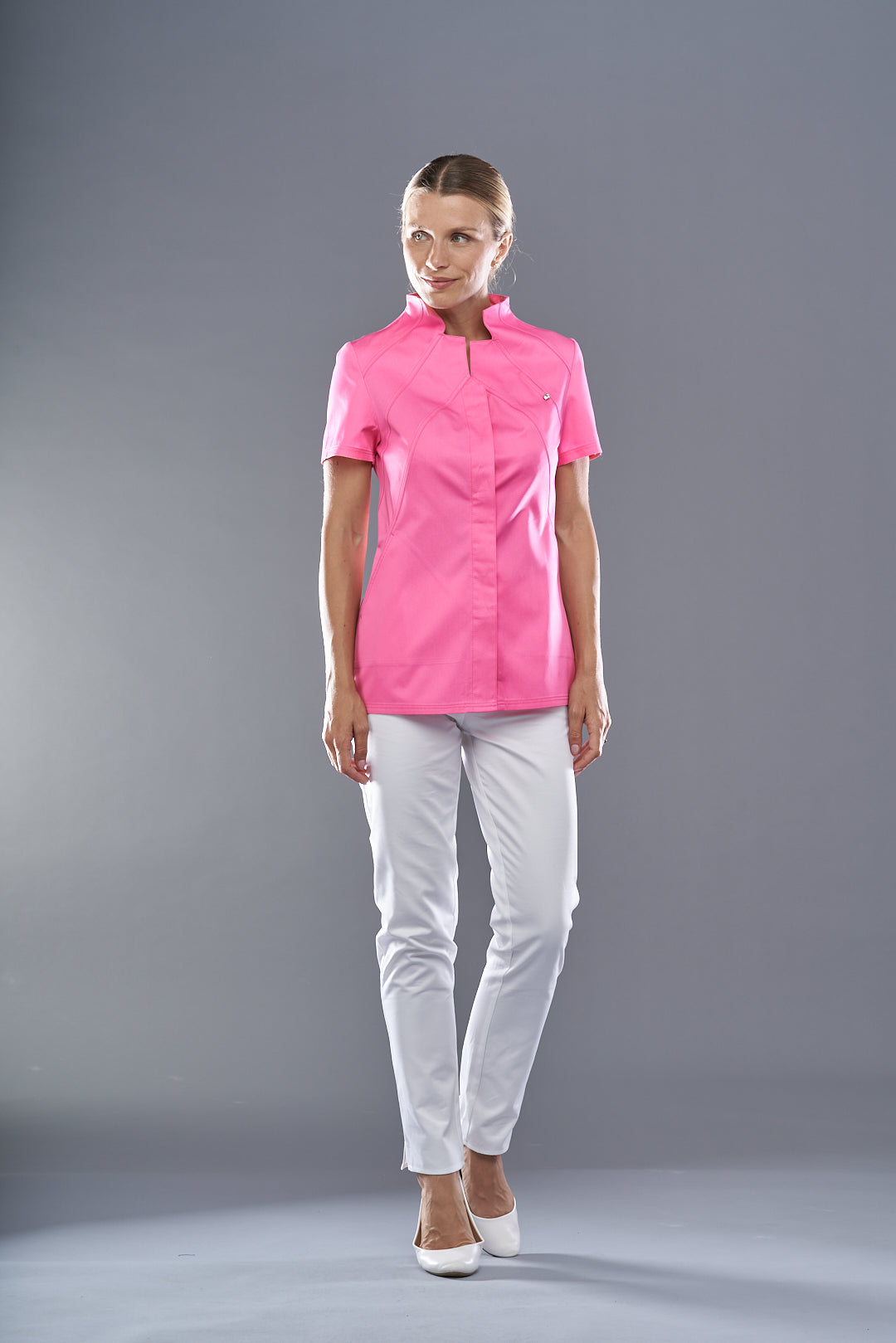 Vevey is an elegant and sophisticated women's tunic by Pastelli, designed to amaze customers and attract attention in the atelier. Medical uniform with a charming Vulcan collar, emphasized by double bias stitching. An elegant uniform that becomes precious thanks to a small Swarovski set on the chest, an elegant light that hides a convenient pocket inserted between the seams.
